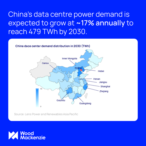 与美国一样,中国的数据中心也才刚刚起步。根据伍德麦肯兹基准预测,中国数据中心的电力需求将以每年约17%的速度增长,到2030年达到479TWh,大致相当于2024年法国全国的电力需求水平。